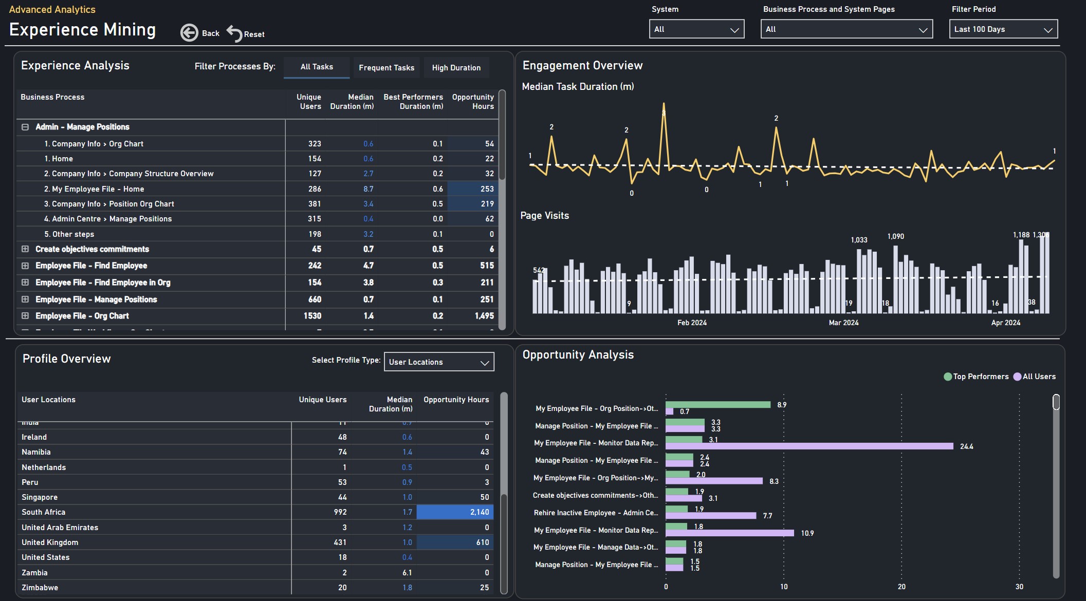 Representing  "Where to focus next?", the bubble chart can be filtered to represent all or specific Business Process and Pages within a single view (size representing Opportunity Hours).  The x-y axis plots the Number of Unique Users by Median task duration (m), with the best opportunities being the "largest" bubble towards the top-right area of the matrix..