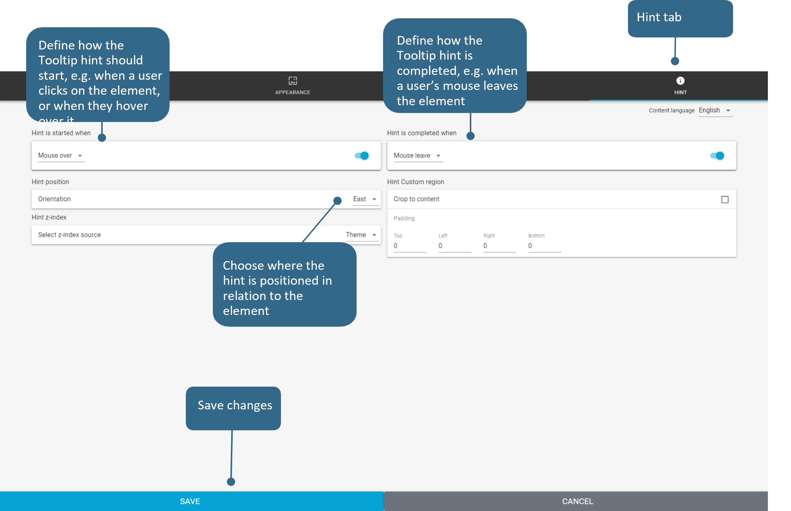 From the Editor, access the **Properties** of a Tooltip, then click the **Hint** tab. Below are some of the key features: