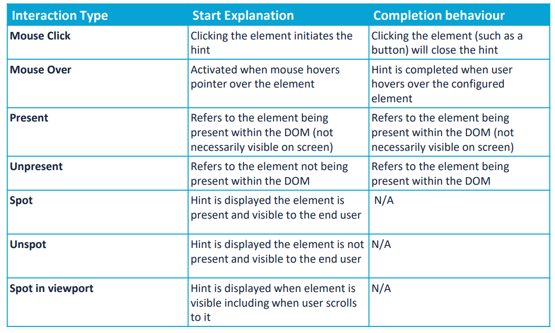 Triggers can be used to control how Tooltip hints are displayed to end users, below is a table of the most common use cases.