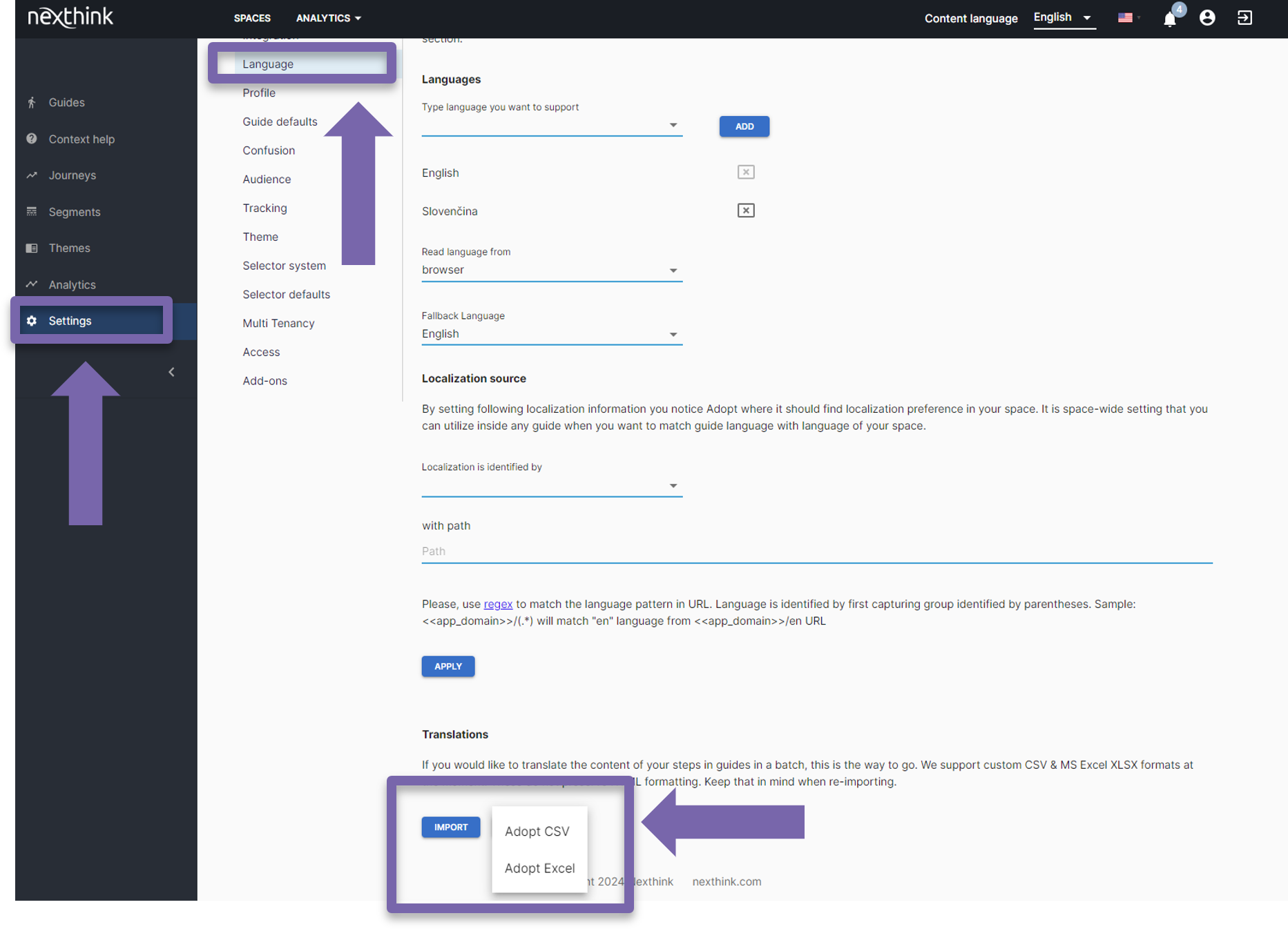 This functionality is useful if you have already created several guides in one language, and want to recreate those guides in different languages. This would potentially mean editing them one by one and would take some time and effort. With the Translation feature, you can export the guides and their steps into either a Comma-Separated Values (CSV) or Microsoft Excel file, then make the required Translation changes before re-importing the files back to the Adopt Console.
